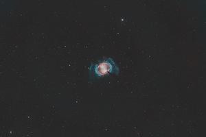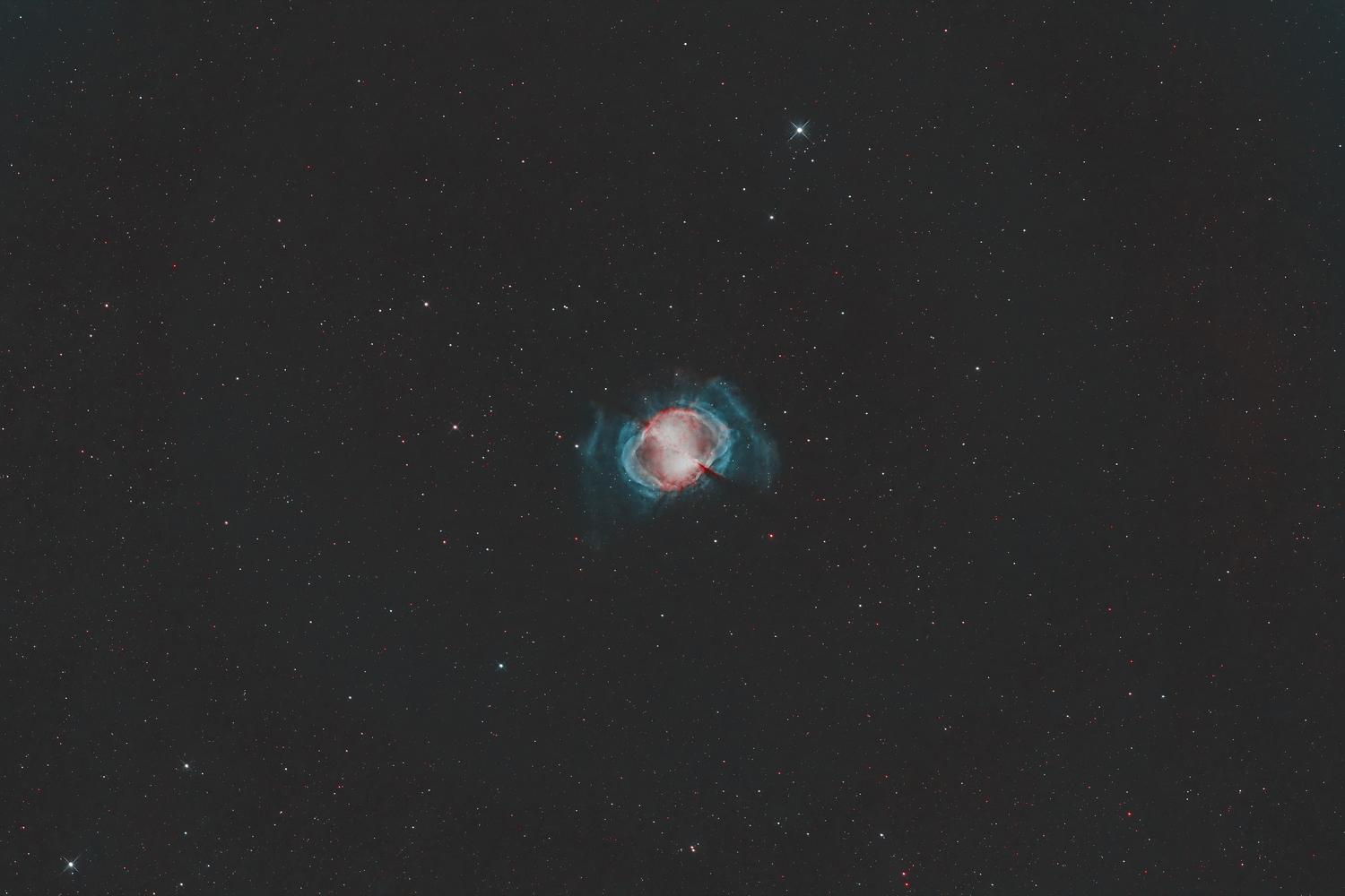 The Dumbbell nebula aka the Apple core nebula Messier 27 is a planetary nebula located in the constellation of Vulpecula. I t is approximately 1360 light years away and was discovered by Charles Messier in 1764.